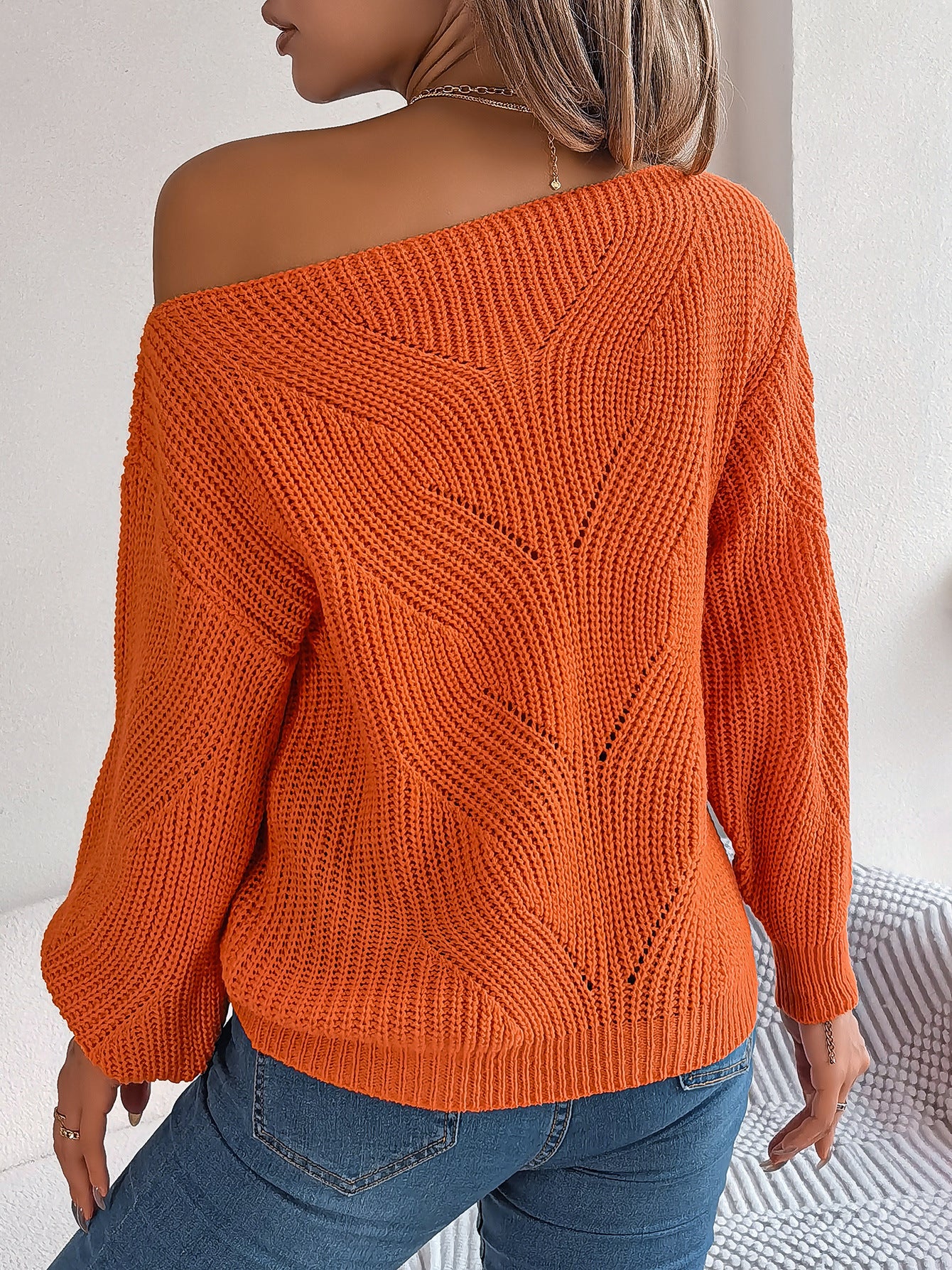 [Moda i moda] Dzianinowy sweter z odkrytymi ramionami ma stylowy i nowoczesny wygląd, idealny zarówno na co dzień, jak i na oficjalne okazje.