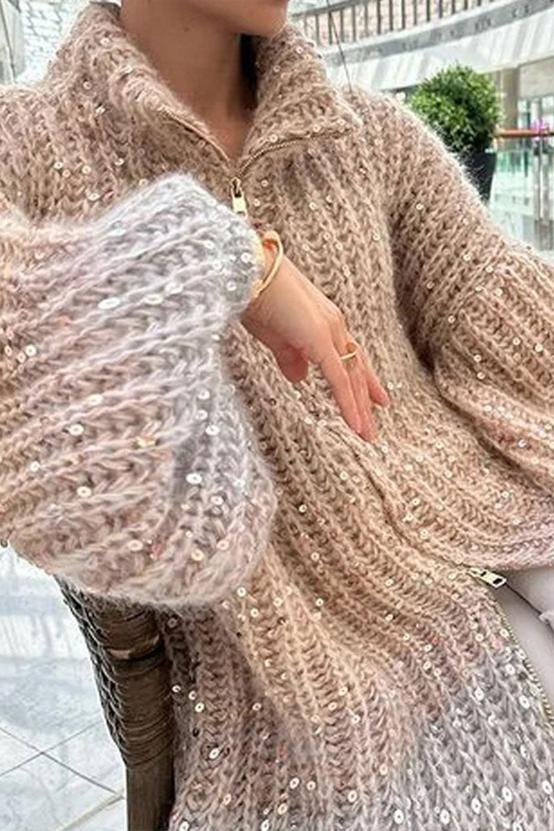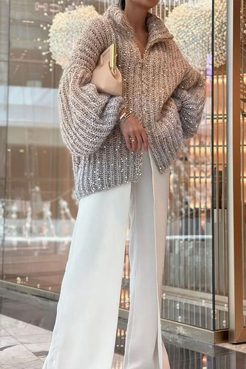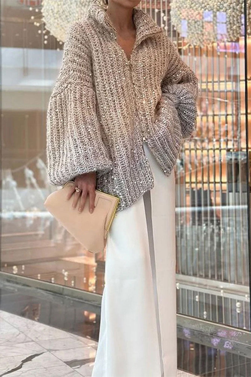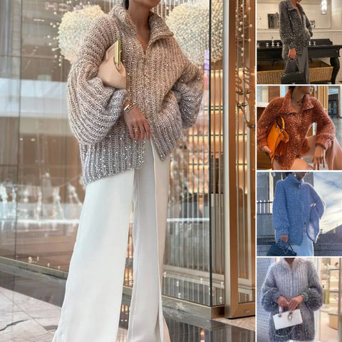 Połącz cekinową kurtkę z dzianiny z małym, pachnącym sweterkiem z dekoltem w szpic, to modne połączenie, które podkreśli elegancki kobiecy urok! ✨👗