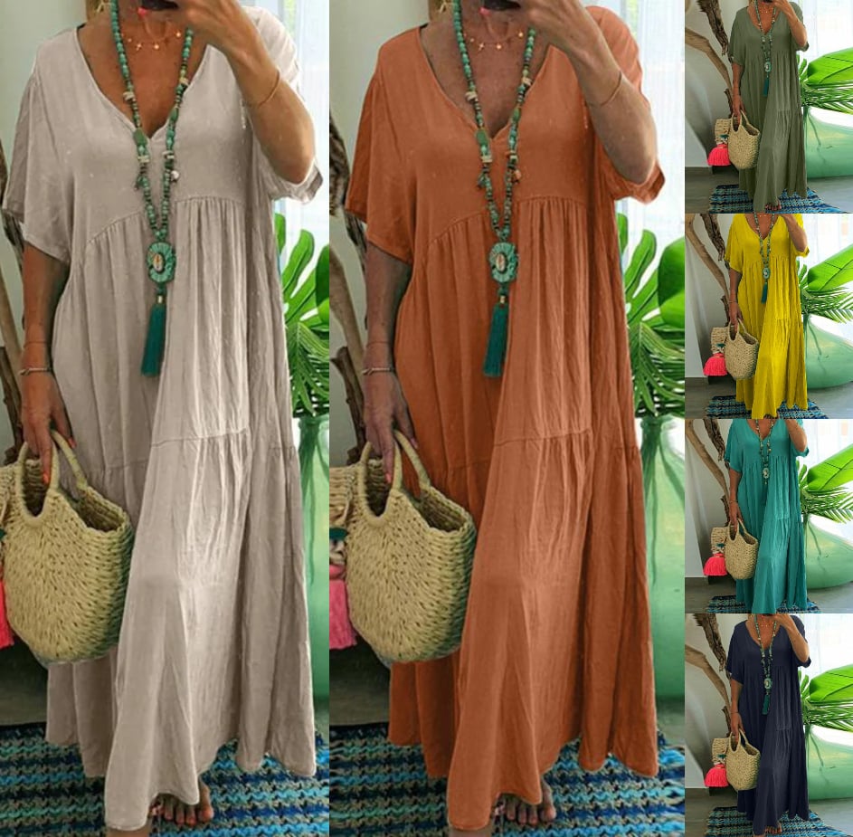 Sprawdź naszą swobodną sukienkę maxi z krótkim rękawem dla kobiet, idealną na wyjścia na plażę lub imprezy w stylu vintage. Sukienka wykonana jest z naturalnego włókna i bawełny, co zapewnia wyjątkowy komfort i trwałość.