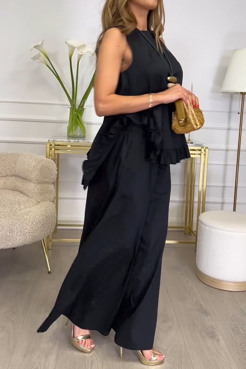 Ten dwuczęściowy zestaw składa się z krótkiego topu i spodni, przy czym góra ma okrągły dekolt, który dodaje mu uroku i kobiecości.