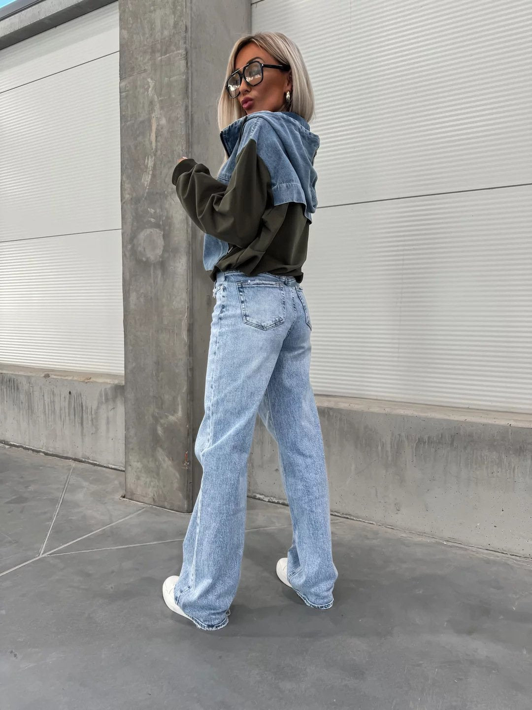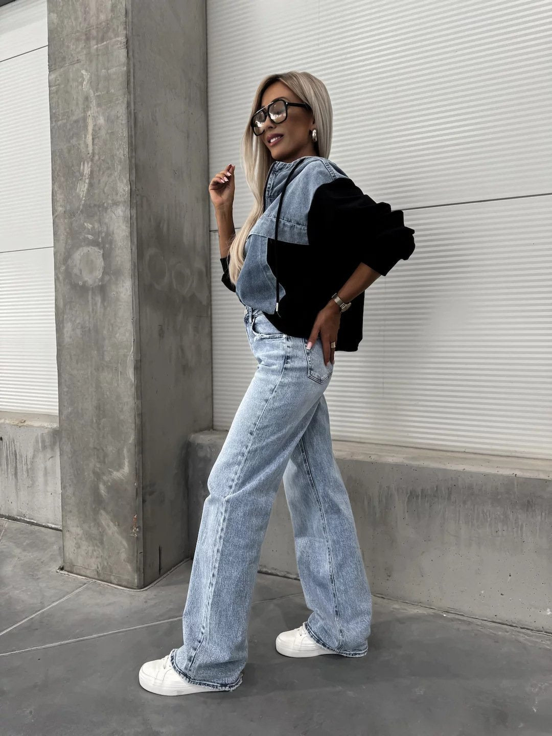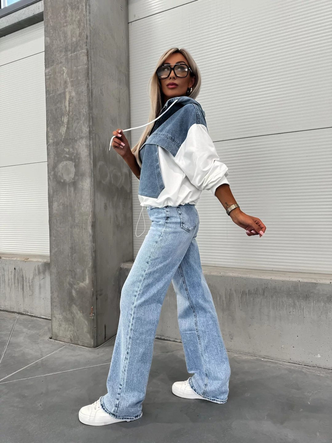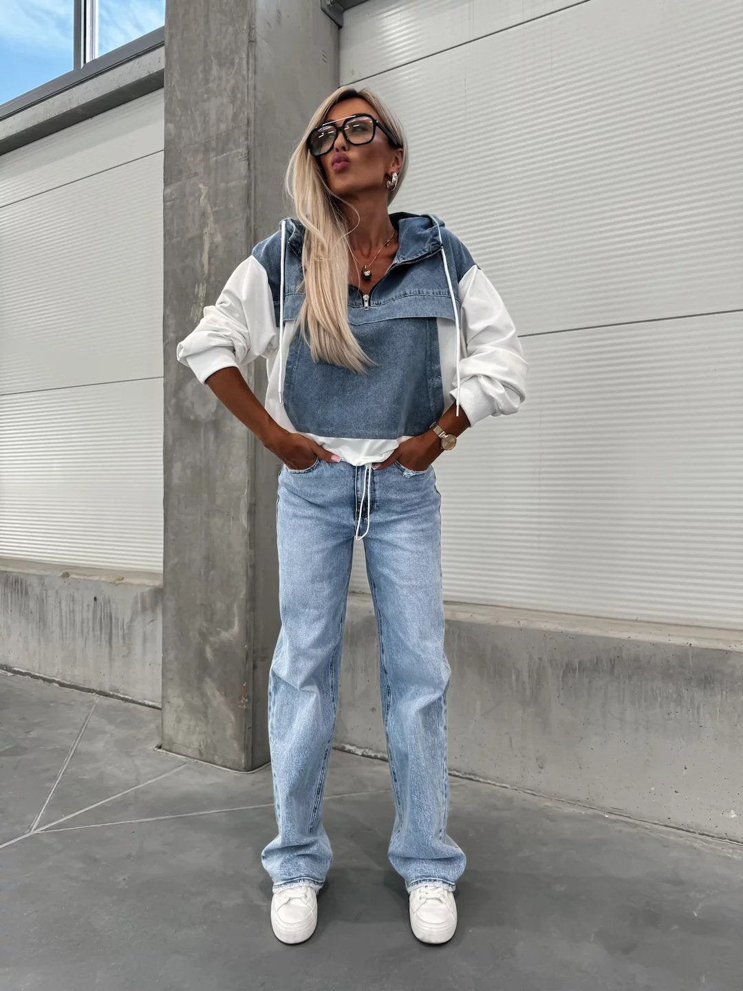 Ta modna bluza ma charakterystyczny patchworkowy wzór dżinsowy , łączący styl klasyczny i współczesny.