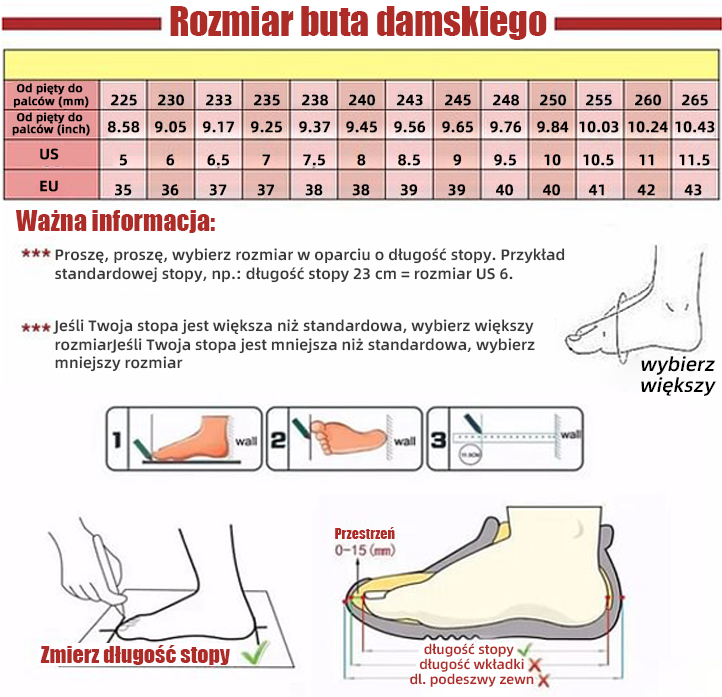Jeśli masz szersze stopy lub wolisz luźniejsze dopasowanie, zamów większy rozmiar.