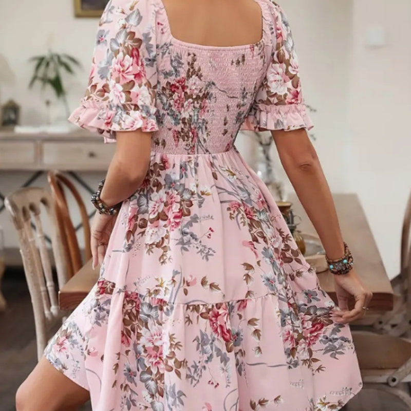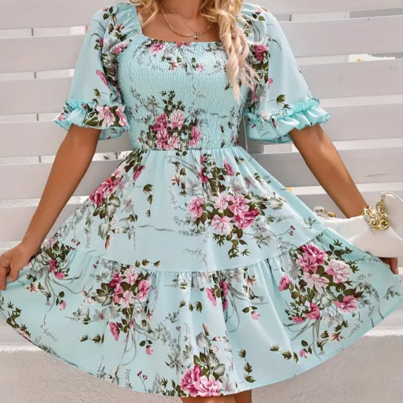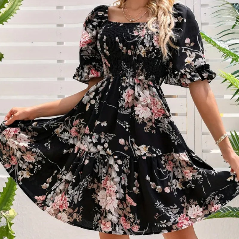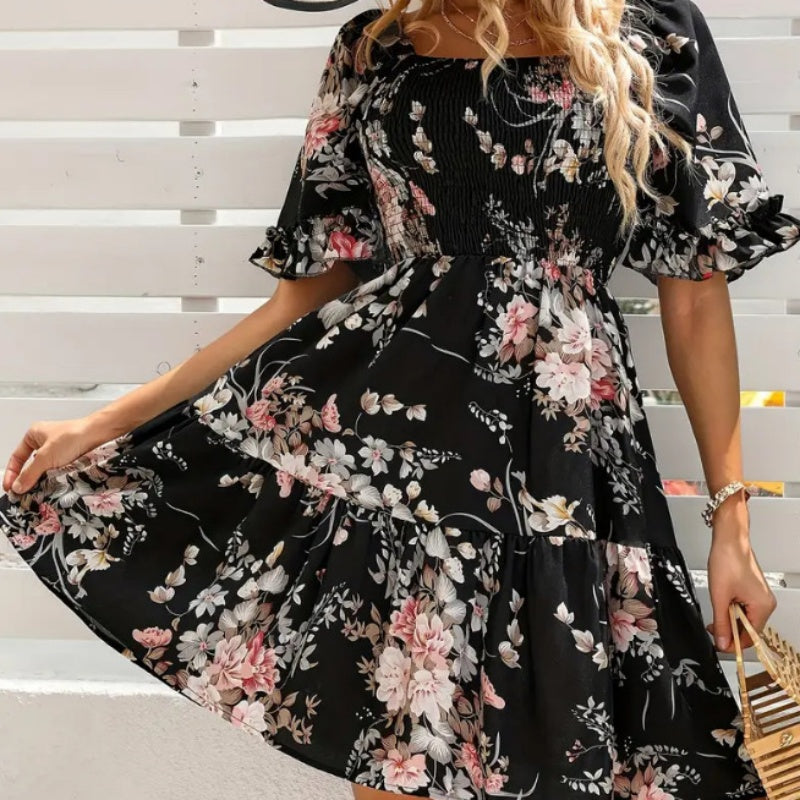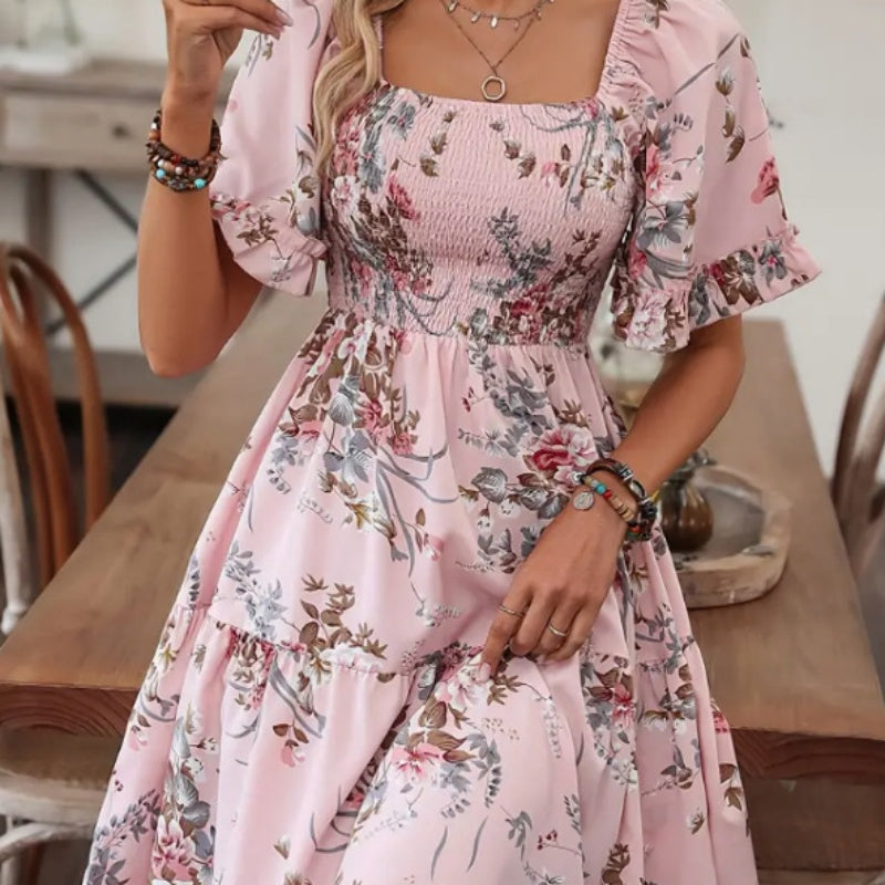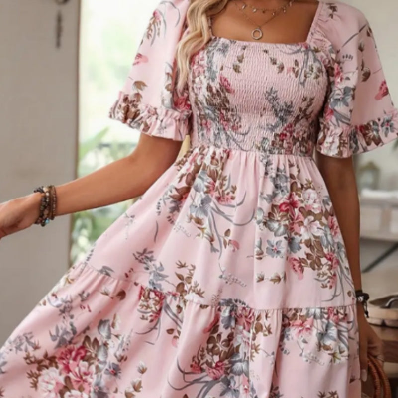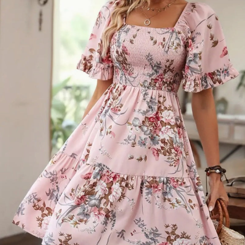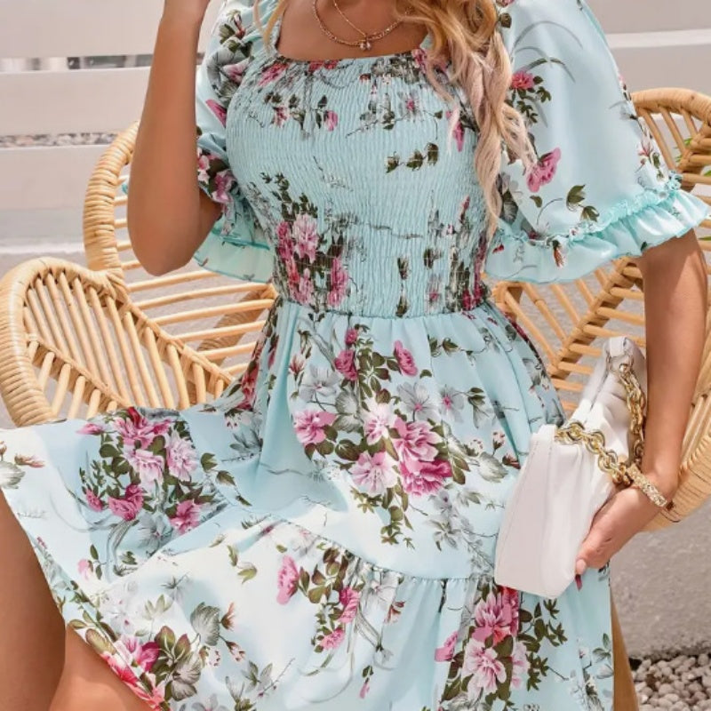 Zakres dostawy: 1 x elegancka damska sukienka z kwadratowym dekoltem i naciskiem kwiatowym.