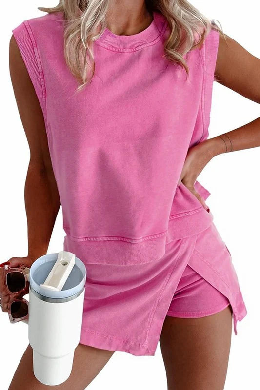 Wprowadzenie naszego dwuczęściowego letniego stroju z wygodnym mineralnym umytym skortem i topem bez rękawów. Z okrągłą szyją i wszechstronnym designem ten strój jest idealny do picklebulki, załatwiania spraw lub po prostu na zakupy. Wyglądaj stylowo i czuj się komfortowo przez całe lato!