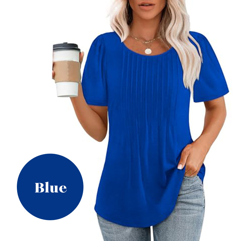 1 * Summer T -koszulka dla kobiet z okrągłym, krótkim, plisowanym rękawem