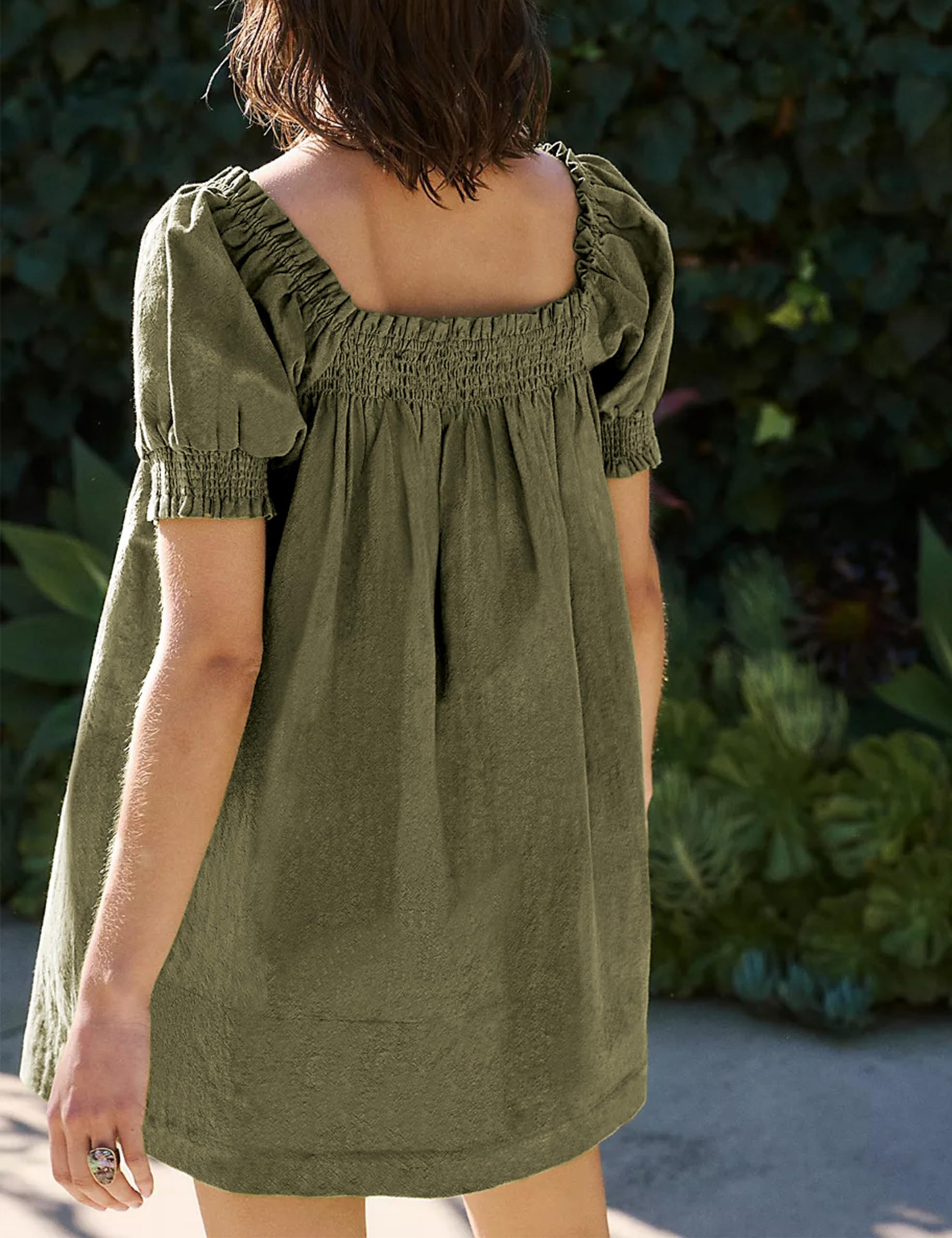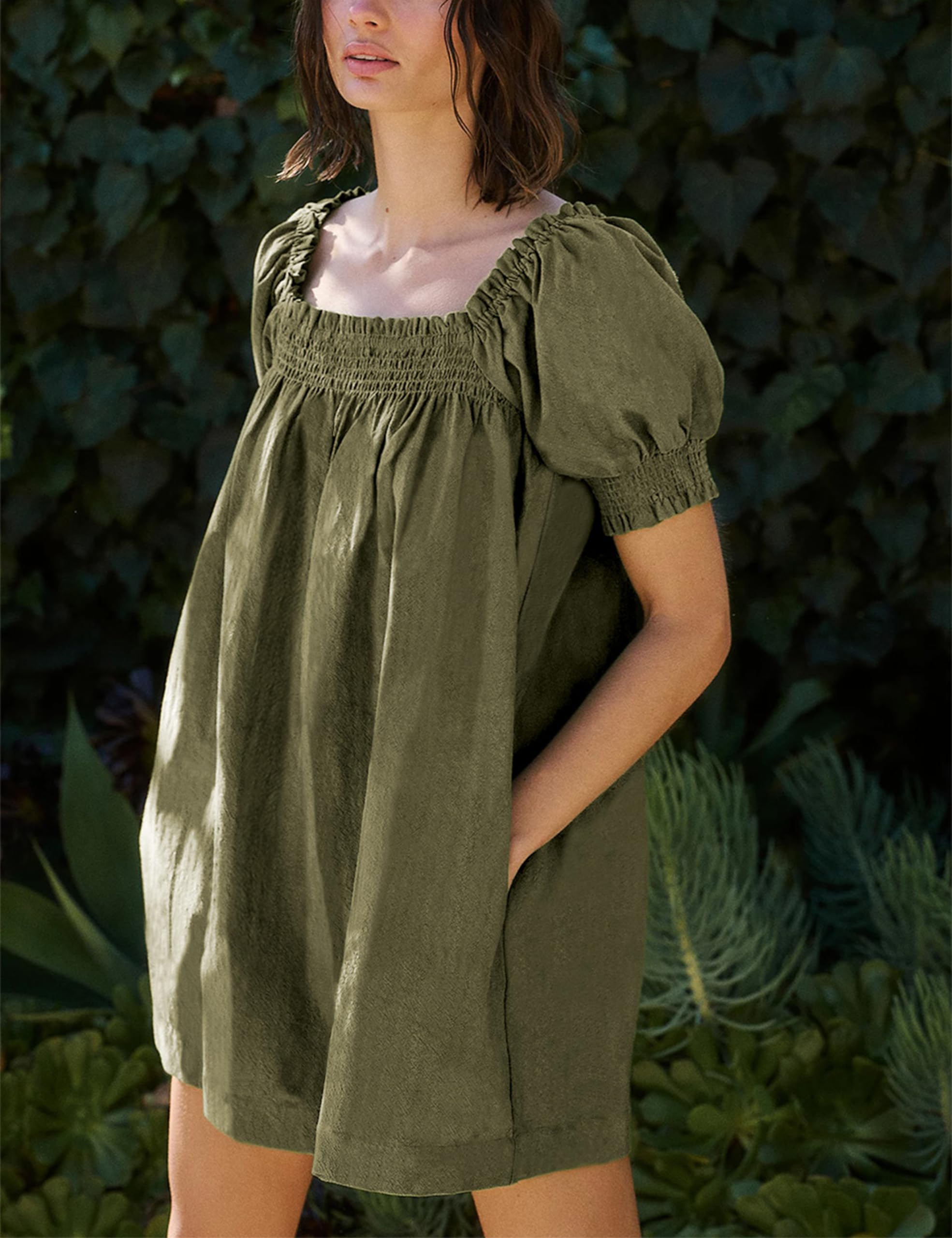 Urocza luźna sukienka z wyrazistymi bufiastymi rękawami, plisowanymi detalami i wygodnymi kieszeniami bocznymi. Kwadratowy dekolt lub odsłonięte ramię, z łatwością zmieniaj swój styl. Będzie nowym ulubieńcem w Twojej szafie!