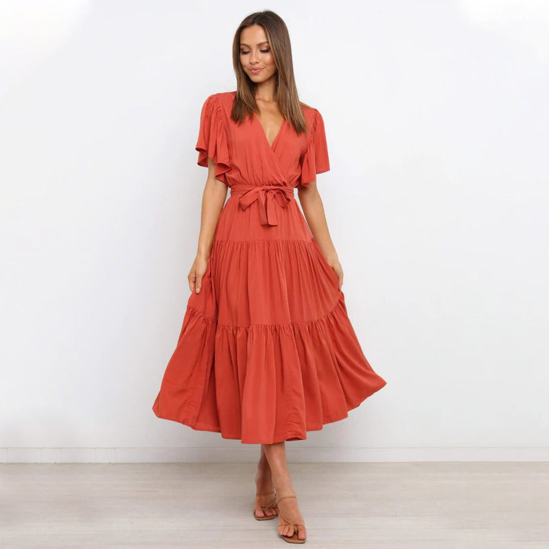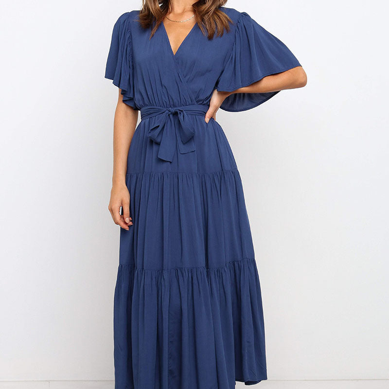 Pakiet zawiera: 1 * Damska plisowana sukienka z dekoltem w szpic i paskiem w talii