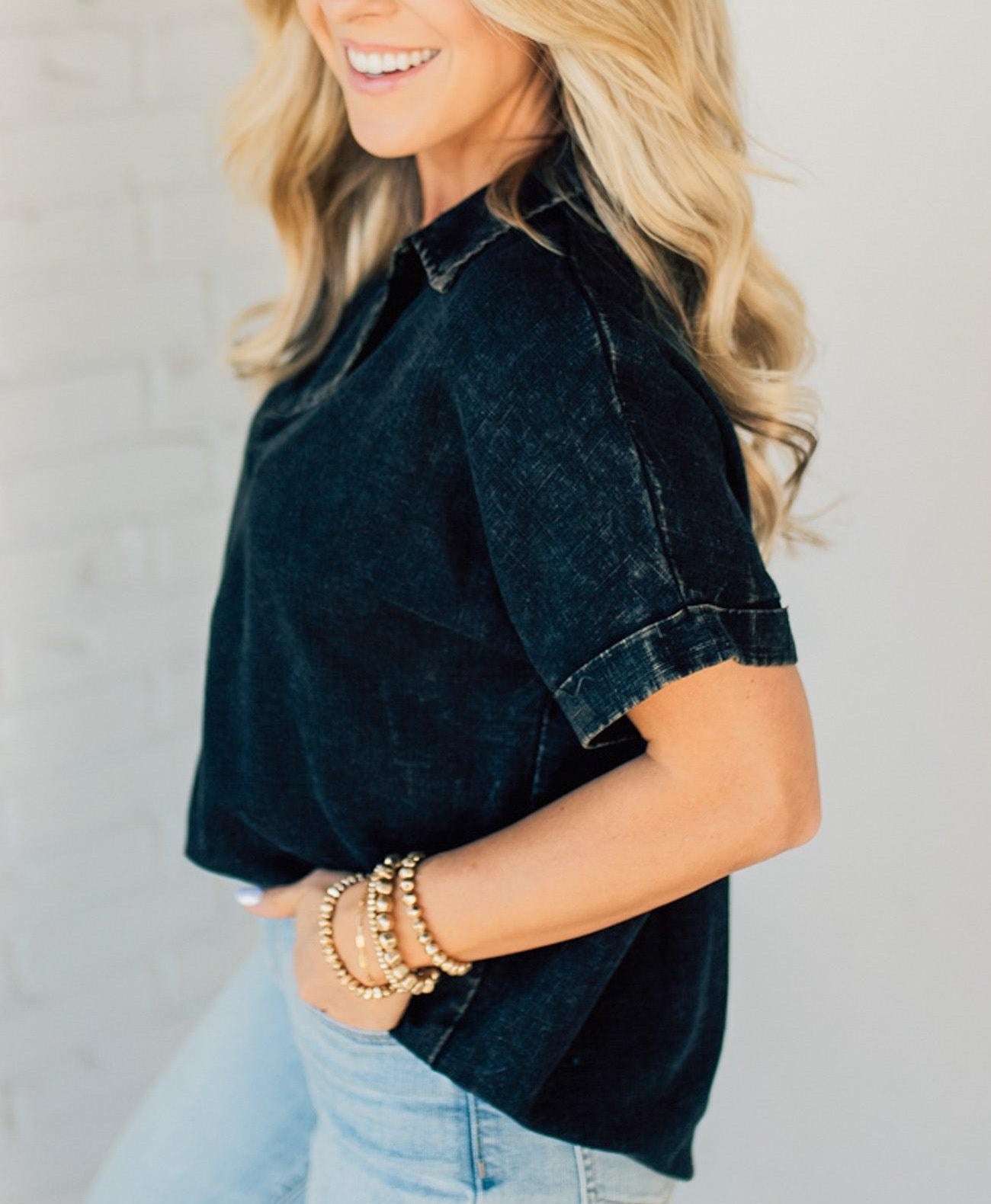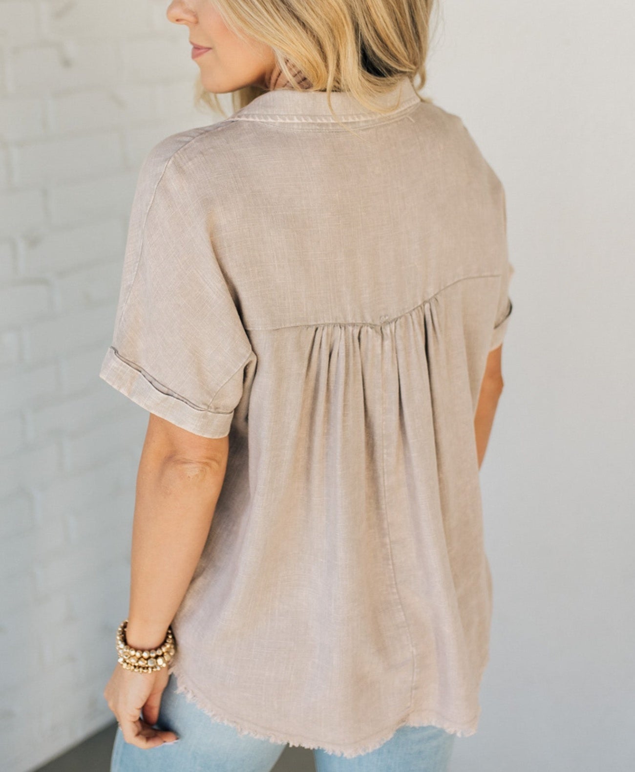 Przygotuj się na unowocześnienie swojej garderoby dzięki naszej bluzce z kołnierzykiem ze spranego lnu! Ta koszula z kołnierzykiem w kształcie litery V, wykonana z miękkiej i lekkiej mieszanki lnu, ma unikalny mineralny efekt i surowe wykończenie. Każdy egzemplarz jest jedyny w swoim rodzaju, a różnice w kolorze i wykończeniu zapewniają naprawdę indywidualny wygląd. Ulepsz swój styl dzięki temu zabawnemu i dziwacznemu topowi.
